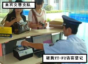 廣西省來賓市公安局交通警察支隊為了避免在訪客管理中存在的管理漏洞與來訪登記信息的虛假性,來賓市公安局交通警察支隊向深圳研騰科技有限公司購買了研騰分體式YT-F2訪客登記管理系統(tǒng)作為單位訪客進出登記管理系統(tǒng)。
