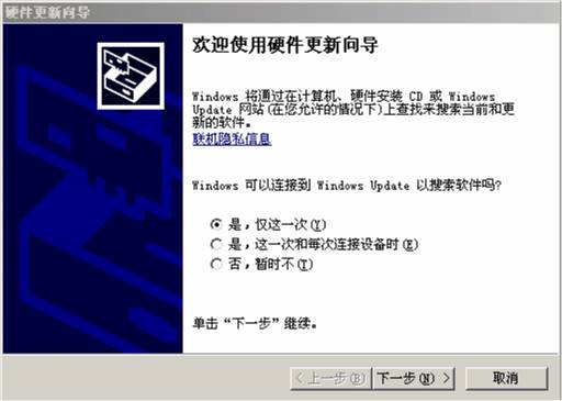 2、正確連接后,出現(xiàn)硬件安裝向?qū)В▓D8),選中“是,僅這一次”,點(diǎn)擊“下一步”按鈕;