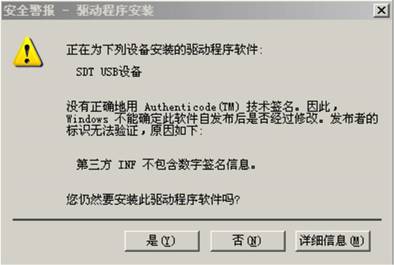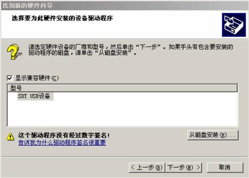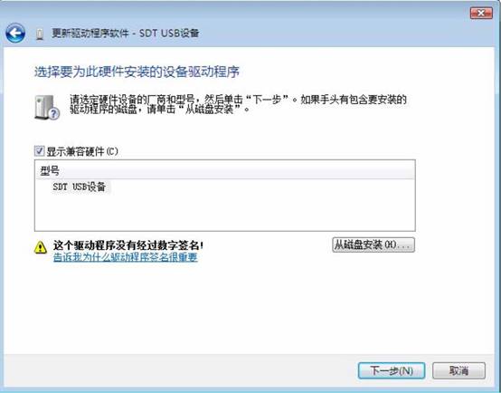 2、在設(shè)備管理器中找到“SDTUSB設(shè)備”,若其圖標(biāo)如圖17所示,則點(diǎn)擊右鍵,選擇“更新驅(qū)動程序軟件”,顯示圖18界面。