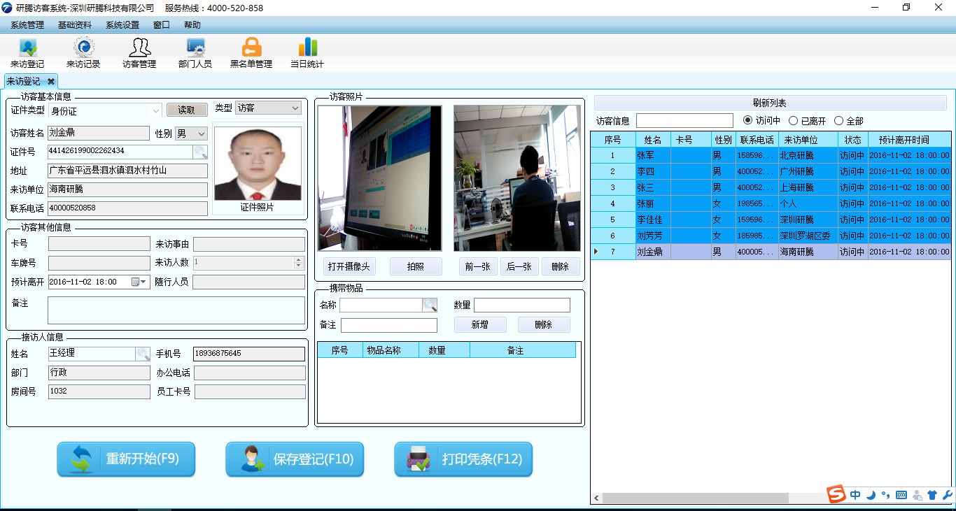 由于每天來(lái)訪(fǎng)的訪(fǎng)客較多,深圳證監(jiān)局啟用了研騰訪(fǎng)客登記管理系統(tǒng),所有來(lái)訪(fǎng)人員需出示身份證到訪(fǎng)客管理員那里登記信息,把身份證放在身份證讀卡器上,網(wǎng)頁(yè)上自動(dòng)讀出來(lái)訪(fǎng)人員的身份信息,然后說(shuō)明來(lái)訪(fǎng)理由,對(duì)著攝像頭拍照,訪(fǎng)客管理人員打印出訪(fǎng)客單,訪(fǎng)客拿著訪(fǎng)客單就可進(jìn)入辦理業(yè)務(wù)了。