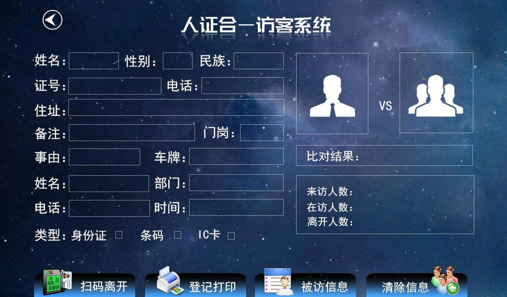 身份證信息登記真?zhèn)巫R(shí)別→人像現(xiàn)場(chǎng)拍照登記→訪客部門(mén)查詢(xún)登記→憑條打印機(jī)打印訪客憑條→進(jìn)入訪客訪問(wèn)→結(jié)束訪問(wèn)刷憑條碼離開(kāi)