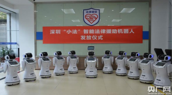深圳市司法局11月23日下午在法律援助處服務(wù)大廳舉行“小法”智能法援機(jī)器人發(fā)放儀式,將10臺(tái)造型萌萌噠的智能法援機(jī)器人分發(fā)到深圳十個(gè)區(qū)“服役”。深圳市司法局黨委書記、局長蔣溪林出席儀式并為這支“機(jī)器人部隊(duì)”送行,寄望她們?yōu)樯钲谌嗣衩篮蒙钐峁└行У谋U?、更?yōu)質(zhì)的服務(wù)。