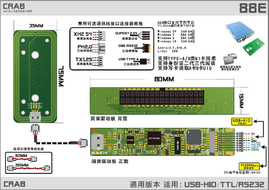 產(chǎn)品內(nèi)含公安部授權(quán)的專用身份證安全控制模塊(SAM),采用國際上先進的Type B非接觸IC卡閱讀技術(shù),完成對身份證有效性驗證和信息的實時讀取。產(chǎn)品有USB接口,也可以根據(jù)需要定制使用RS232或TTL接口。