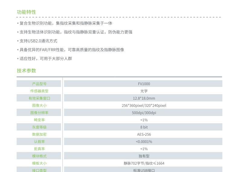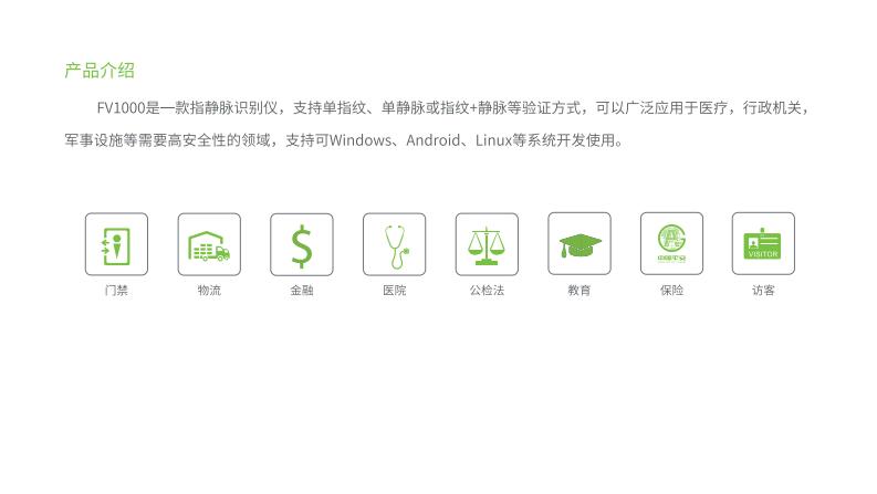 FV1000指靜脈采集器是熵基科技FV1000指靜脈采集器研發(fā)的一款基于光學(xué)的指靜脈識(shí)別身份認(rèn)證產(chǎn)品。該產(chǎn)品集指紋和靜脈采集于一體,支持活體識(shí)別功能,適用性強(qiáng),可應(yīng)用于大部分人群。該產(chǎn)品體積小,支持標(biāo)準(zhǔn) USB 通訊;配合 SDK 開(kāi)發(fā)包,可實(shí)現(xiàn)指紋、指靜脈模板的提取、比對(duì)等功能,安全可靠。支持 1:1、1:N 的單指紋、單靜脈或指紋+靜脈等驗(yàn)證方式。能夠在 Windows、Android、Linux 系統(tǒng)下進(jìn)行二次開(kāi)發(fā),適用于金融、保險(xiǎn)、醫(yī)療、教育、考勤、物流、交通、訪(fǎng)客等諸多行業(yè)。