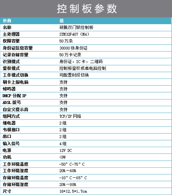 【研騰雙門(mén)門(mén)禁控制主板】是深圳研騰科技最新研發(fā)的TCP/IP多功能門(mén)禁系統(tǒng)。系統(tǒng)自帶大容量存儲(chǔ)功能,50萬(wàn)條權(quán)限,50萬(wàn)條記錄,3萬(wàn)身份證完整信息存貯,支持多種混合開(kāi)門(mén)方式(身份證、IC卡、二維碼等),支持控制多種不同種類的門(mén)(閘機(jī)、自動(dòng)門(mén)、電鎖門(mén))??刂瓢蹇墒跈?quán)開(kāi)門(mén),也可不授權(quán)刷身份證即開(kāi)。研騰多功能門(mén)禁控制板可以保存刷卡人所有身份證信息,刷卡時(shí)間,以便查詢,當(dāng)發(fā)生安全事故時(shí)提供有力證據(jù),進(jìn)一步加強(qiáng)了安全性和可靠性。